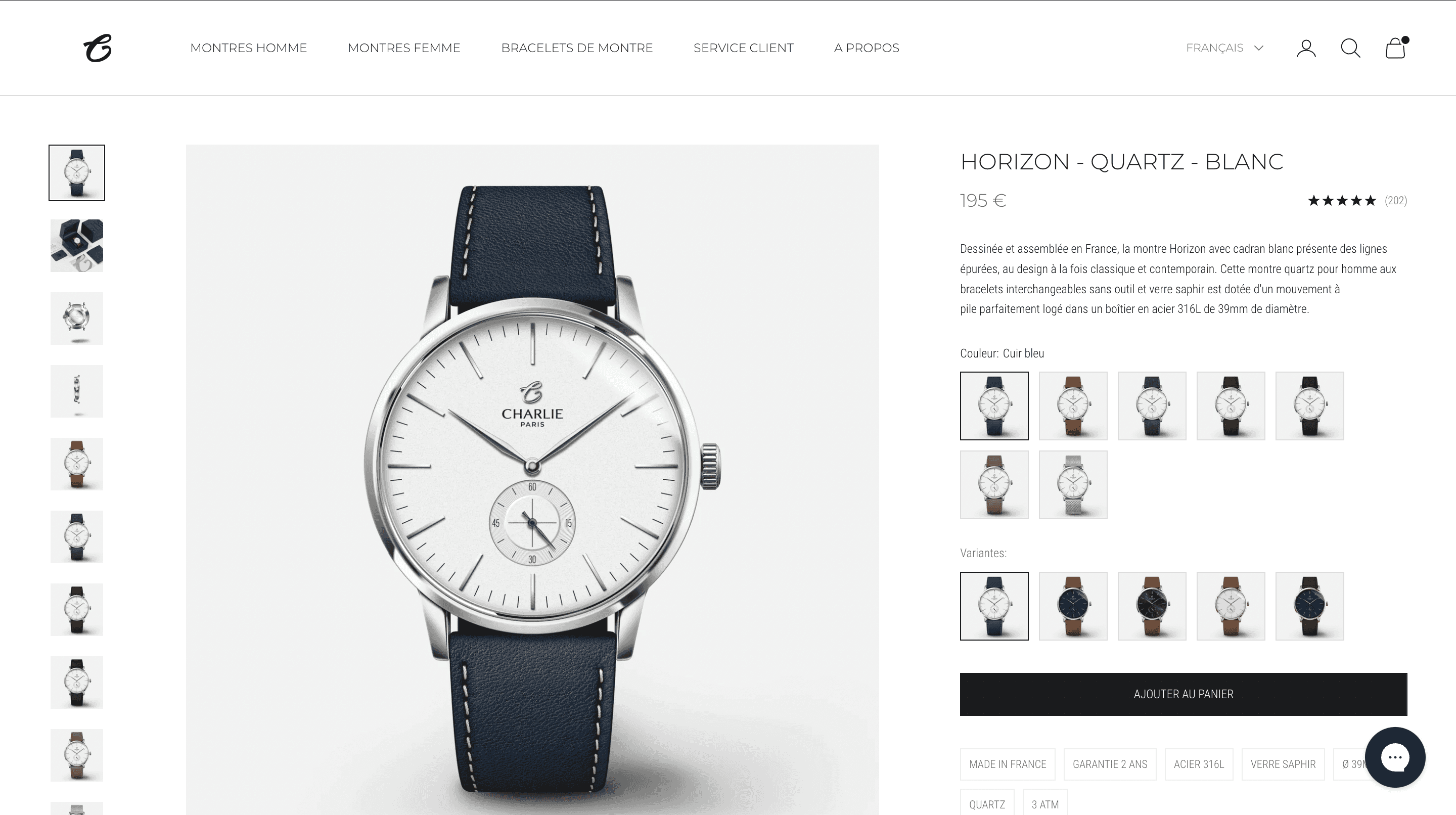 Sur cette page produit, on peut voir que l'élément le plus imposant est la photo de la montre, car c'est ce que le visiteur va potentiellement acheter. Vient ensuite le titre, puis le prix. Le bouton CTA "ajouter au panier" prend également toute la largeur de la partie droite de l'écran afin d'être bien visible et mis en avant.