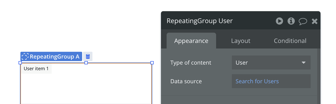 Dans cet exemple, le repeating group est configuré pour afficher une liste de data types "User", que l'on va aller chercher dans la base de données en réalisant une recherche "Do a search for".