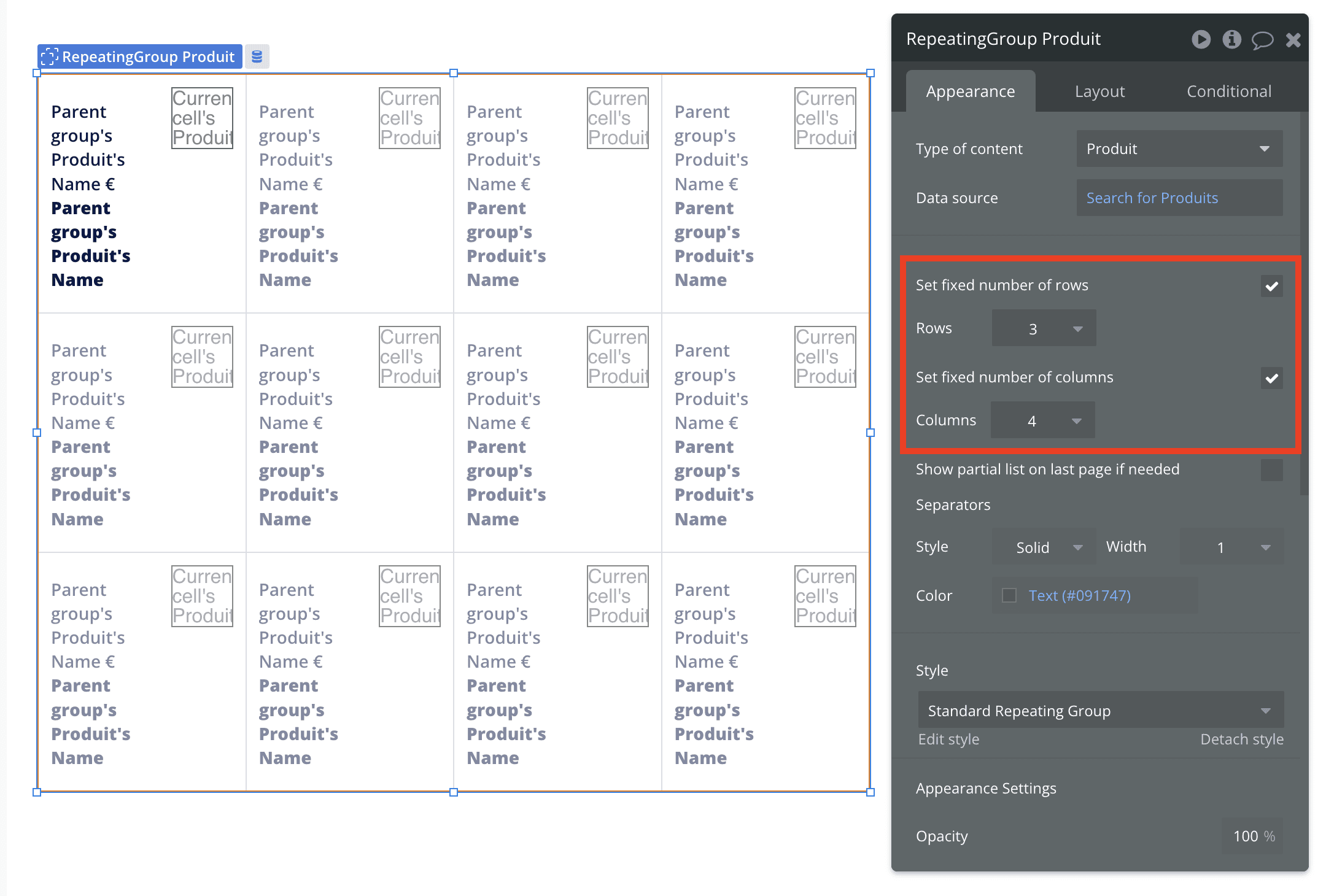 Nombre de colonnes et de lignes : Vous pouvez spécifier combien de lignes et de colonnes le repeating group doit afficher. Par exemple, une liste d’utilisateurs peut s’afficher dans une seule colonne (format de liste verticale) ou en plusieurs colonnes (format de grille).