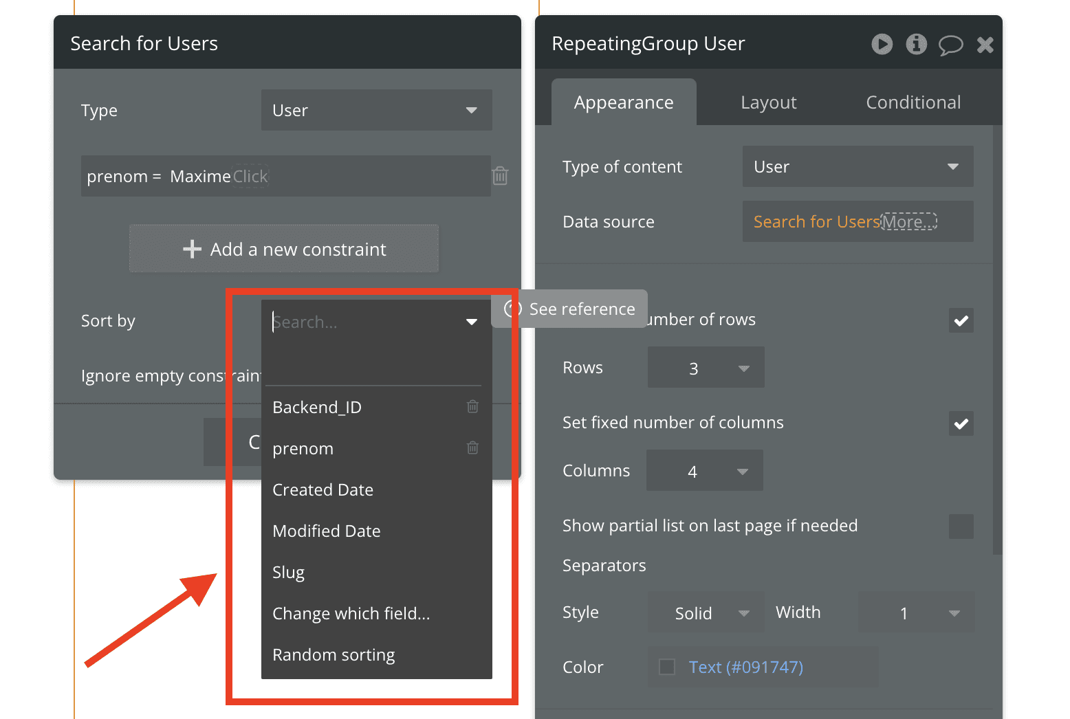 Appliquer le tri : Dans la source de données du repeating group, ajustez les paramètres pour appliquer le tri choisi par l’utilisateur.